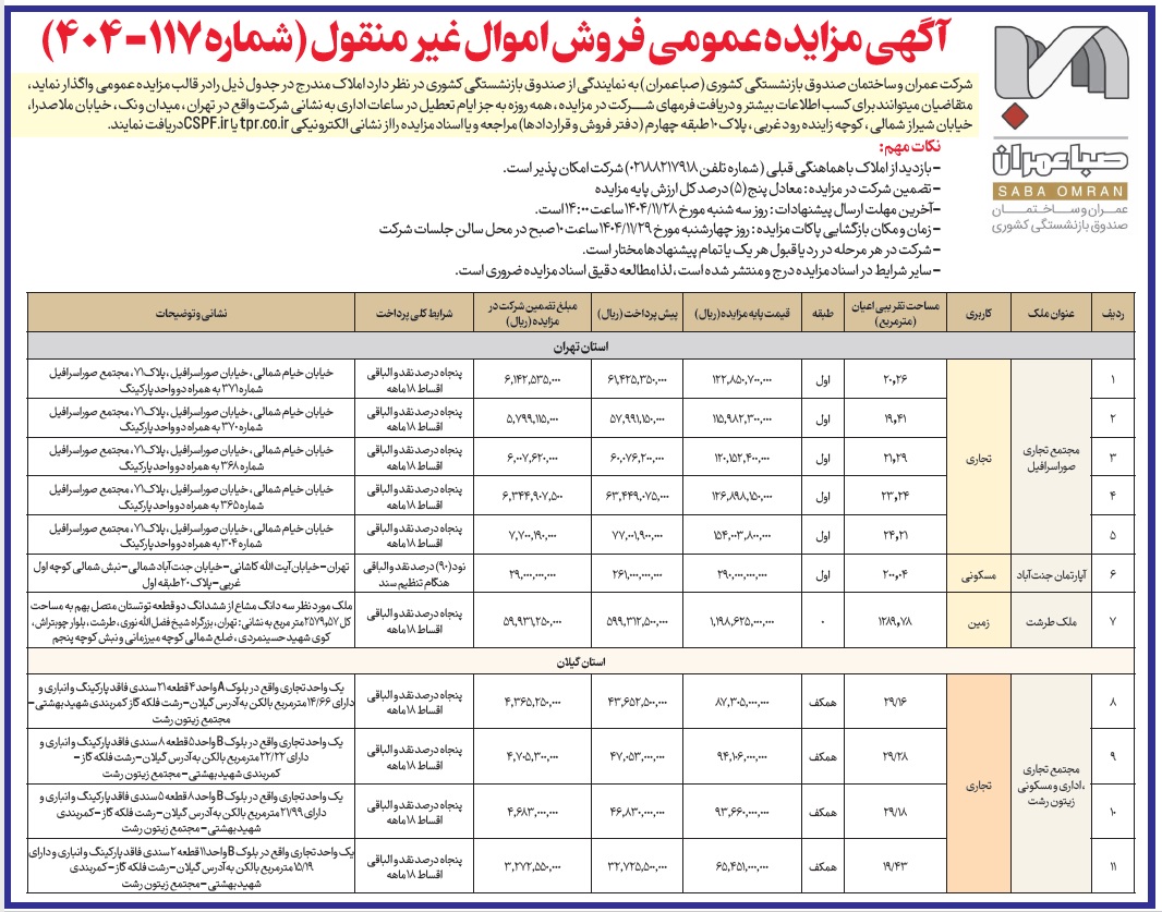 1) اسناد مزایده واحدهای مجتمع تجاری صور اسرافیل به همراه قیمت واحدها